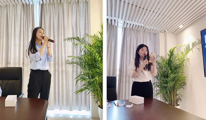 伴隨著現(xiàn)場緩緩奏起的輕音樂,主持人Sandy在進(jìn)行自我介紹和現(xiàn)場預(yù)熱后,以抽簽形式開始了歌曲競唱環(huán)節(jié),國際市場部的Sabrina自告奮勇獻(xiàn)唱曲,熱情演唱了經(jīng)典英文歌曲——《 Trouble is a friend 》,贏得現(xiàn)場陣陣掌聲!