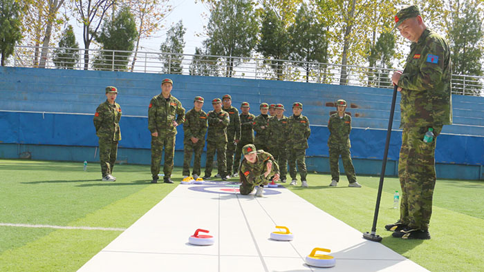 在【旱地冰壺】項(xiàng)目中,八個(gè)小組的隊(duì)員們一邊商榷對敵戰(zhàn)術(shù),一邊進(jìn)行任務(wù)分配。隨著一聲哨響,兩個(gè)賽隊(duì)同時(shí)開賽。隊(duì)員們?nèi)褙炞?、凝神靜氣,向前邁步?jīng)_刺,揮動手臂擲壺,冰壺按照隊(duì)員們設(shè)想的路線擊打到對方的冰壺,使其滑出得分圈并穩(wěn)穩(wěn)地停留在中心點(diǎn),成功得分,大家歡呼雀躍,圍觀隊(duì)員們也紛紛叫好,掌聲、歡呼聲此起彼伏,好不熱鬧。