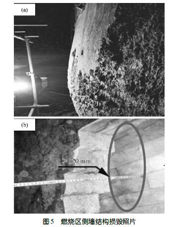 不同焚燒階段,工藝溫度差異較大,各段爐墻受熱不均勻。其中,燃燒段是溫度較高區(qū)域,主要是絕熱爐墻和風(fēng)冷爐墻兩種結(jié)構(gòu),風(fēng)冷爐墻的穩(wěn)定性要明顯好于絕熱爐墻的。但是無(wú)論哪種結(jié)構(gòu),服役時(shí)間較長(zhǎng)以后,均會(huì)出現(xiàn)鼓包凸起。圖5(a)是絕熱爐墻服役一段時(shí)間后爐墻明顯鼓包照片,中心區(qū)域凸起高度達(dá)到200 mm 以上。圖5(b)示出了爐墻服役過(guò)程中的風(fēng)冷爐墻,殘余風(fēng)冷爐墻空氣夾層厚度由設(shè)計(jì)的60 mm 擴(kuò)展為120 mm。