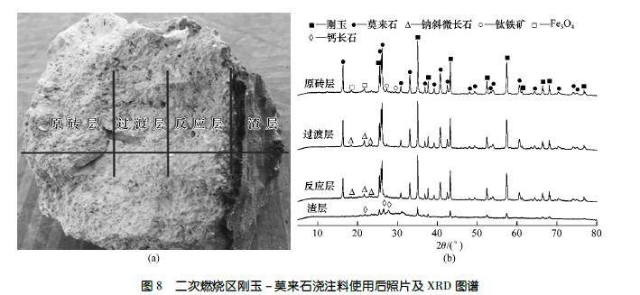 圖8是二次燃燒區(qū)用后剛玉- 莫來(lái)石澆注料殘襯照片以及各層的XRD 圖譜。分析表明,反應(yīng)層、滲透層形成了少量的長(zhǎng)石類(lèi)礦物相。在實(shí)際工況下,長(zhǎng)石類(lèi)礦物的熔點(diǎn)較低,高溫是熔融狀態(tài),熔渣與耐火材料反應(yīng)形成的低熔點(diǎn)物向熔渣中溶解,并逐漸被高速含塵煙氣沖刷掉,終導(dǎo)致內(nèi)襯耐火材料被磨穿。