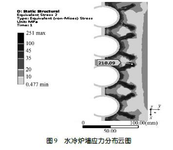 焚燒爐余熱發(fā)電鍋爐水冷壁配置厚度70 ~ 110mm 耐火可塑料或者澆注料,使用后會(huì)出現(xiàn)銷(xiāo)釘頭端面以外的耐火材料分層并脫落,脫落區(qū)域附近有細(xì)小裂紋。根據(jù)圖9 所示水冷爐壁應(yīng)力模擬分析可知,高溫條下,金屬錨固件的熱膨脹大于耐火材料的,在耐火材料與金屬銷(xiāo)釘界面應(yīng)力較大區(qū)域,大量銷(xiāo)釘共同作用使耐火材料產(chǎn)生分層,導(dǎo)致耐火材料脫落。