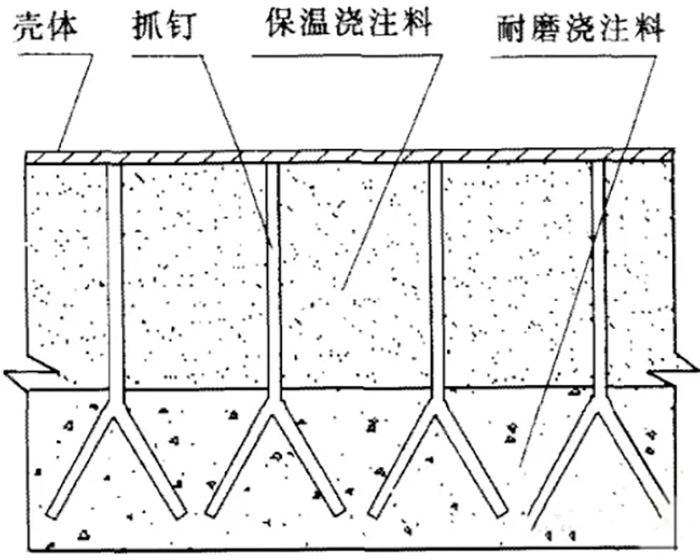 如圖6所示,為采用固定抓釘和高溫燒結磚的澆注料結構形式,在耐磨