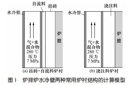 國內(nèi)外爐排爐在水冷壁內(nèi)襯結(jié)構(gòu)設(shè)計(jì)上有較大差別,國外爐排爐水冷壁內(nèi)襯結(jié)構(gòu)為鰭片(扁鋼)掛釘+SiC掛磚+SiC自流料填充密封,簡(jiǎn)稱膜式壁結(jié)構(gòu);國內(nèi)則為水冷管錨固釘+SiC澆注料結(jié)構(gòu)。不同的爐襯材質(zhì)和結(jié)構(gòu)對(duì)水冷壁內(nèi)襯傳熱有較大影響,目前尚未見爐排爐水冷壁內(nèi)襯熱傳導(dǎo)研究報(bào)道。