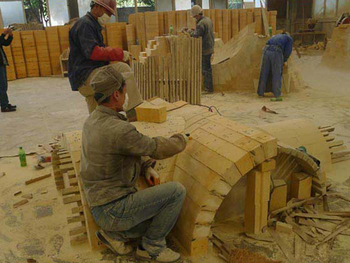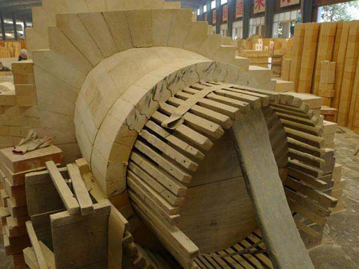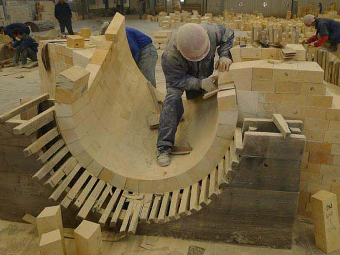 熱風爐系統接口孔洞部位的耐火磚是易損部位,傳統的設計和施工方法很堆滿足高爐高風溫的要求,使用組合磚技術可較好地解決這一難題。熱風爐組合磚是由幾種簡單幾何體,陽貫而形成的復雜空間幾何體,其內含有數十種或數百種組合磚單體,這些組合磚互相鎖緊,并均勻傳遞應力,結構十分牢固,從而獲得較長使用壽命。